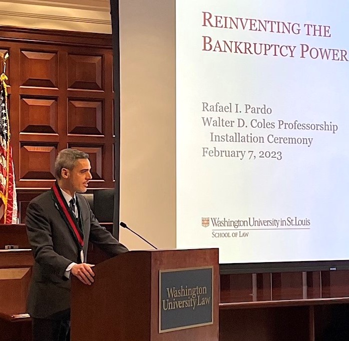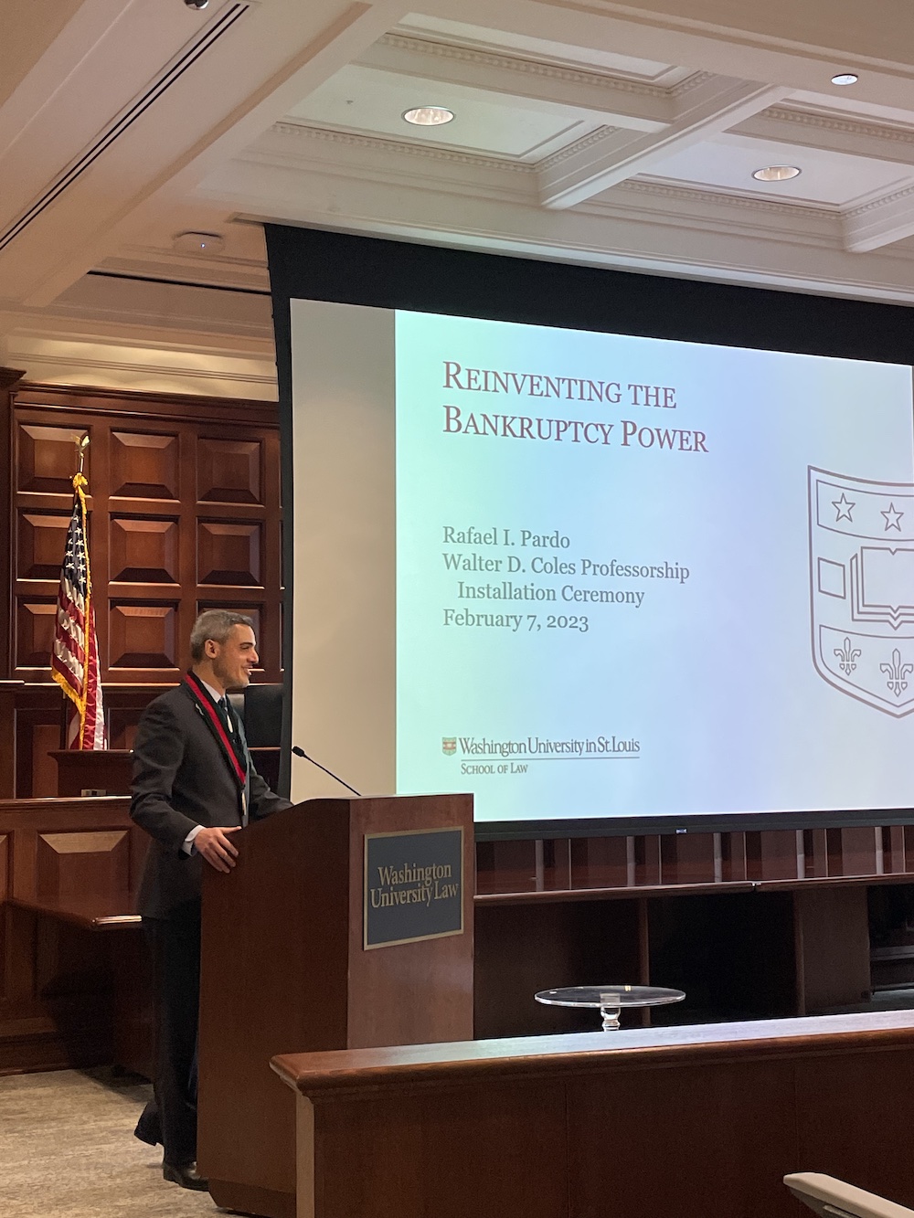 The installation ceremony of Professor Rafael I. Pardo as the Walter D. Coles Professor of Law took place yesterday in the Bryan Cave Moot Courtroom. The event included remarks from Dean Russell K. Osgood, Professor David Hoffman of the University of Pennsylvania Carey Law School, and Provost Beverly Wendland. Professor Pardo also gave an address titled “Reinventing the Bankruptcy Power.”