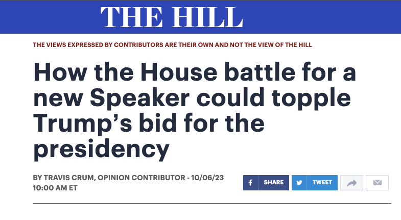 Head to the Opinion Section of The Hill for a recent piece by Associate Professor Travis Crum. Titled “How the House battle for a new Speaker could topple Trump’s bid for the presidency,” the article discusses the debate over the Insurrection Clause.