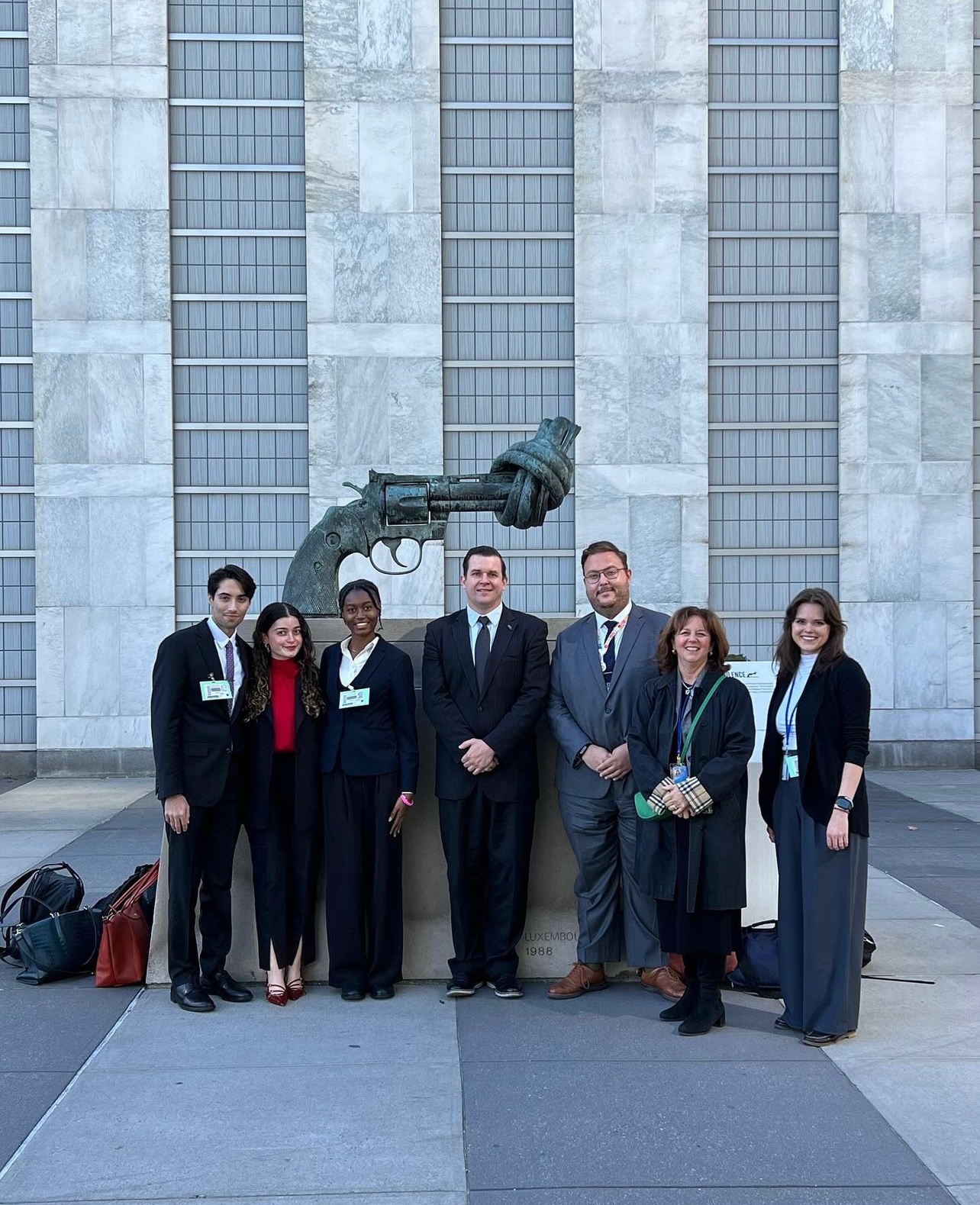 Tariq Rajei (2L), Mina Nur Basmaci (3L), Andrea Charles (3L), Zej Moczydlowski (3L), Douglas Pivnichny (WashU Law ’13, UN Legal Officer, Codification Division), Professor Leila Sadat, and Kelly Adams (WashU Law ’22, Legal Advisor, Global Justice Center) at the Non-Violence statue in the central United Nations plaza.