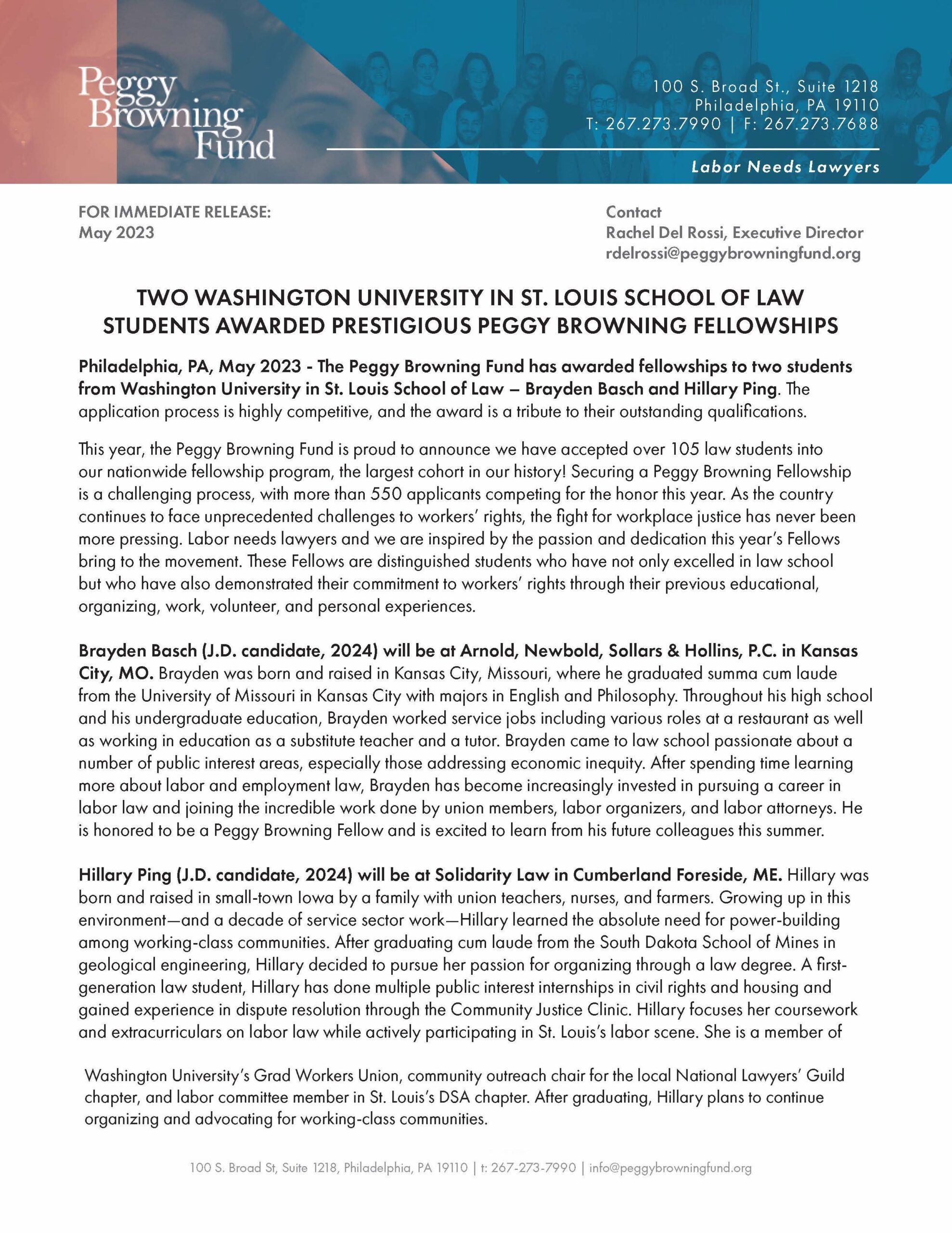We are pleased to announce Brayden Basch and Hillary Ping, both 2024 JD candidates, have been awarded fellowships through the Peggy Browning Fund. Congratulations!